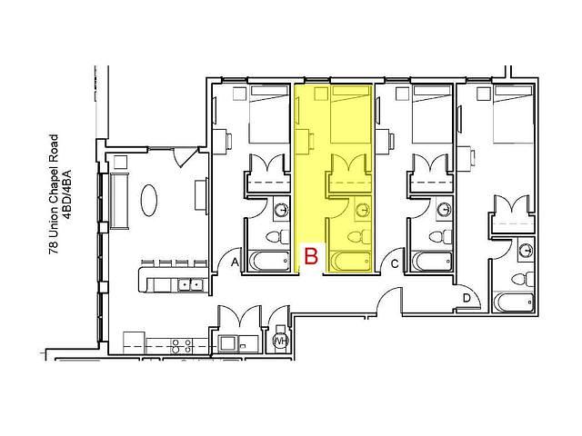 Private bedroom and bathroom with shared kitchen, living area, washer, dryer, balcony, and patio.